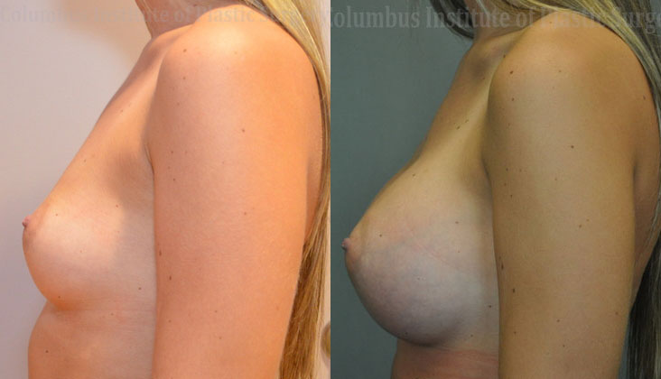 This 24 year old woman came to Columbus Institute of Plastic Surgery for a breast augmentation with saline breast implants. She had 360cc implants placed below her muscle and the incision is made at the underside of the breast, hidden in the crease. The after photo here was taken 6 weeks after surgery.