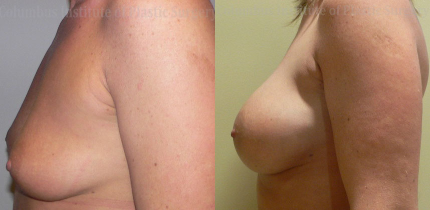 This is a 36 year old woman from Thornville, Ohio. She wanted a breast augmentation at the Columbus Institute of Plastic Surgery. After carefully considering saline breast implants versus silicone breast implants, she decided to have a silicone breast augmentation using 400cc silicone implants. Her after photos were taken 1 year after surgery. Her incision was under the breast and the implants were placed below the muscle.