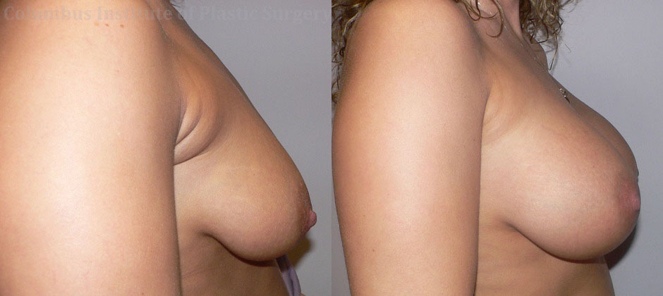 This is a 35 year old woman from Reynoldsburg, Ohio who wanted improvement to her breasts. She had quite a bit of breast sag (ptosis). She decided to have a breast augmentation with silicone implants. She decided against having a breast lift due to the scars on the front of the breast. She has a 400cc implant on the right side and a 350 cc implant on the left side. The after photos were taken 2 months after surgery.