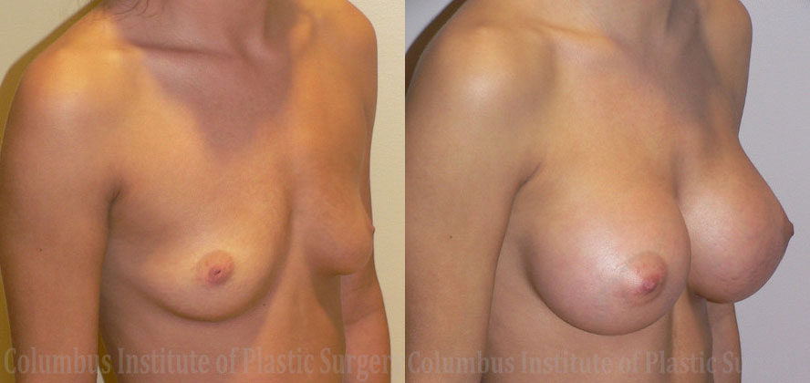 This 20 year old woman came to The Columbus Institute of Plastic Surgery for a saline breast augmentation. She and the plastic surgeon, Dr. Bivik Shah, decided upon a 450cc implant on the right and a 500cc implant on the left to correct the unevenness she naturally has. The after photo was taken 3 months after surgery. Delaware OH.