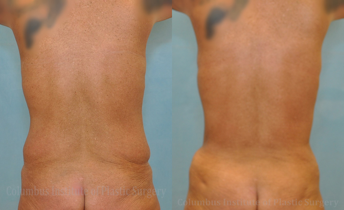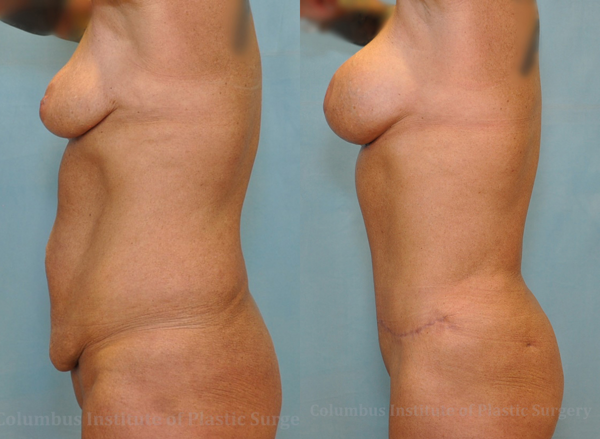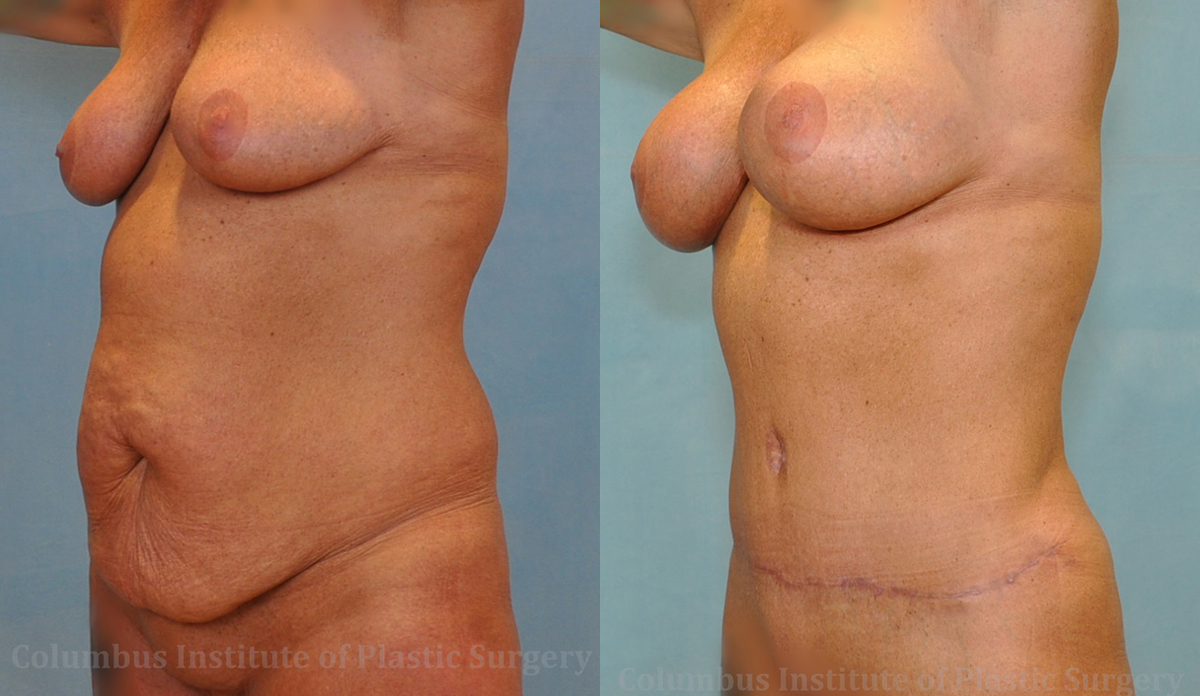This is a 46-year-old woman from Amanda, Ohio who wanted plastic surgery of the abdomen. She didn’t like her loose skin. She had tried exercise, dieting, and everything she could think of to get rid of the fat and extra skin. She decided to have a tummy-tuck and liposuction to the flanks (love handles) with top plastic surgeon, Dr. Bivik Shah at the Columbus Institute of Plastic Surgery. She is pictured before and 9.5 months following surgery.