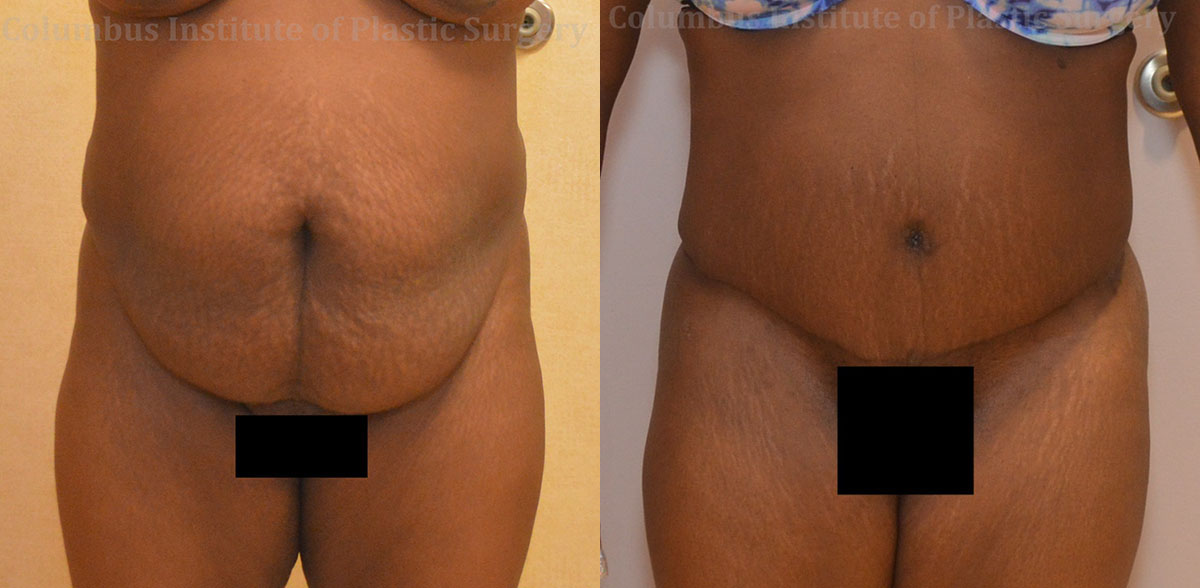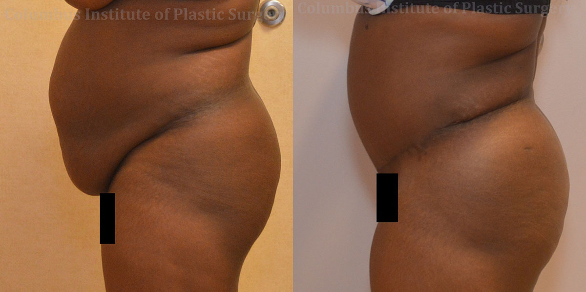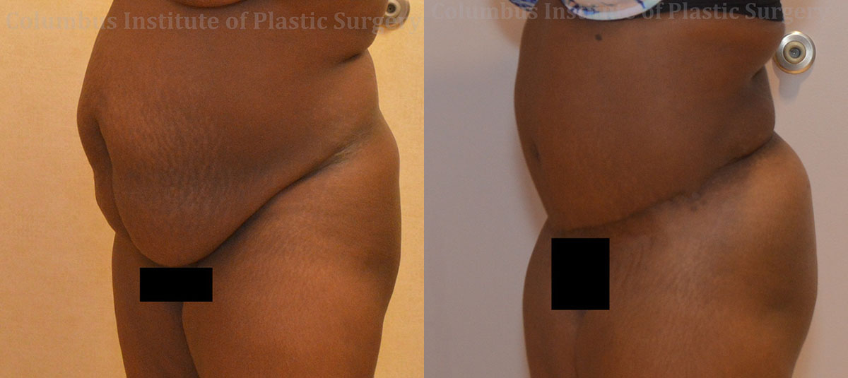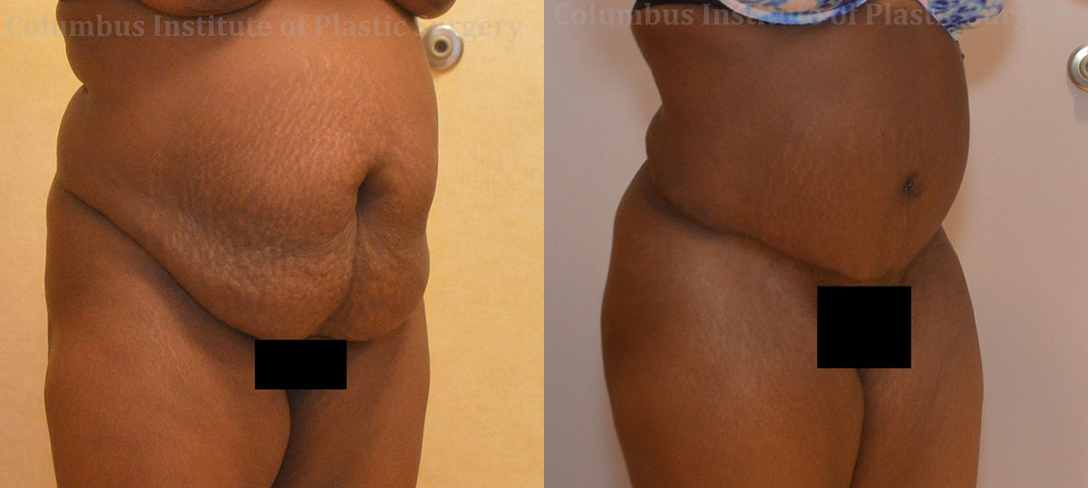 This beautiful African American woman from Groveport, Ohio wanted to remove excess fat and skin from her abdomen and reclaim her body. She was referred by a friend to top surgeon Dr. Bivik Shah at The Columbus Institute of Plastic Surgery. He did just that, and also repaired her weakened abdominal muscles, creating a firmer profile. She loves her new tighter, firmer mid-section. She is photographed here before and only 4 months following her abdominoplasty (tummy-tuck).