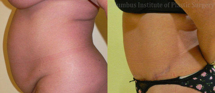 This woman came to The Columbus Institute of Plastic Surgery from Westerville, Ohio to meet with the plastic surgeon, Dr. Bivik Shah. She had quite a bit of excess skin and fat that had been making her uncomfortable. Dr. Shah discussed with her the options she had. Together, they decided that for her to get the best results, she would have a tummy tuck (abdominoplasty). Within this procedure, 4.6lbs was removed from her abdomen. This incision here runs from hip to hip. The after photo was taken ten months after surgery and her scar will continue to look better and better over the next eight months.