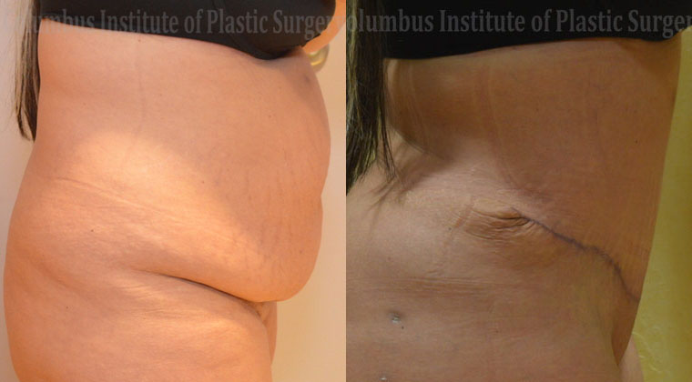 This 40 year old woman from Cleveland came to Columbus for an abdominoplasty (tummy tuck). The incision is made from hip to hip and is easily hidden below the bikini line. This procedure is done to rid the patient of all that loose excess skin on their abdomen. This is also the best way to get rid of stretch marks. Typically the muscles are tightened and the skin is pulled down real tight for a very smooth look. The after photo here was taken 2 months after surgery.