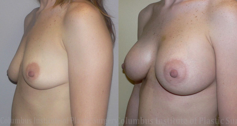 This 28 year old woman came to The Columbus Institute of Plastic Surgery for a Breast Augmentation. She met with the plastic surgeon, Dr. Bivik Shah and they discussed her options. This patient could have benefited from a breast lift, however she did not want the incisions on the front of her breasts. Because she did not have a breast lift, her nipples sit more to the lower part of her breasts rather than centered. She decided upon saline breast implants alone. The right is filled to 325cc and the left to 350cc. The after photo was taken 2 weeks after surgery.