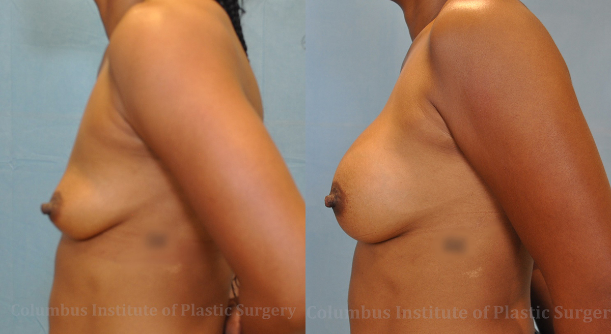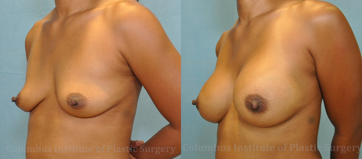 This is a 38-year-old African American woman from Pickerington, Ohio, who wanted a breast augmentation or breast enhancement at the Columbus Institute of Plastic Surgery. After a discussion with top surgeon Dr. Bivik Shah about size, she selected 350cc silicone breast implants for both of her breasts. The incision was placed in the breast crease, and is easily hidden. The after pictures are 4 months after surgery.