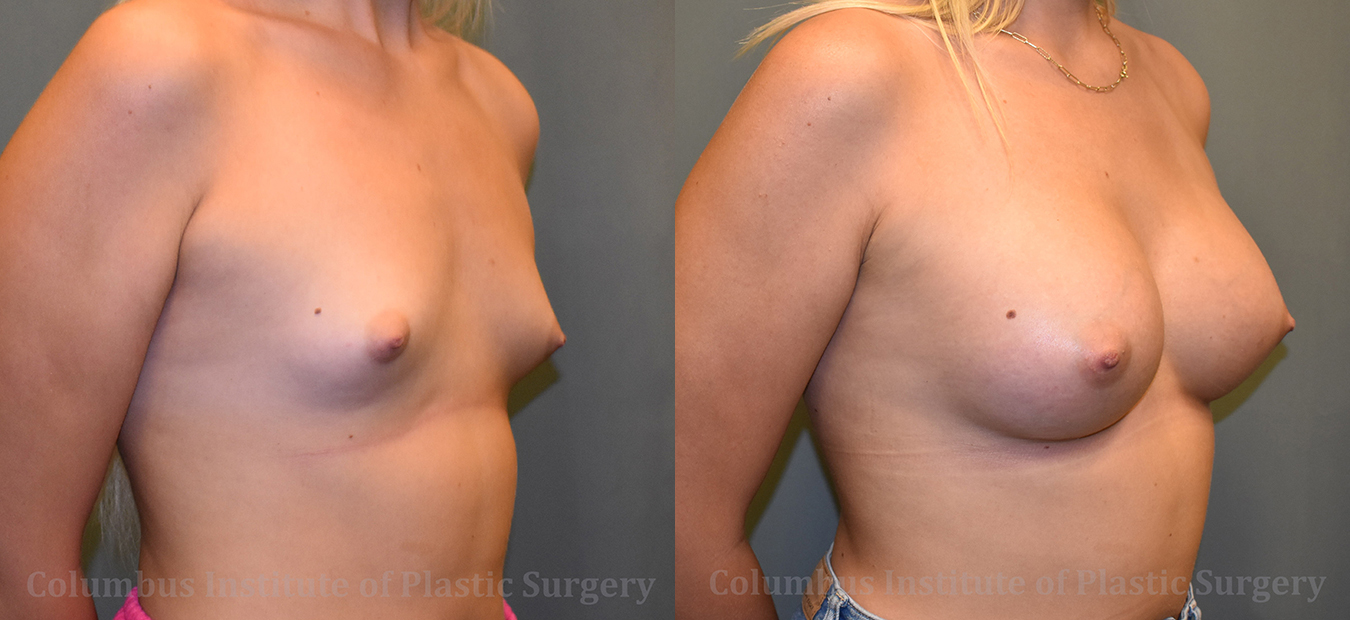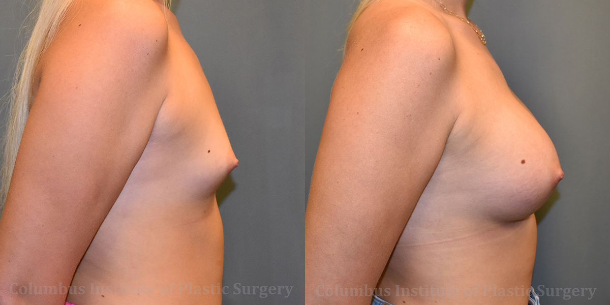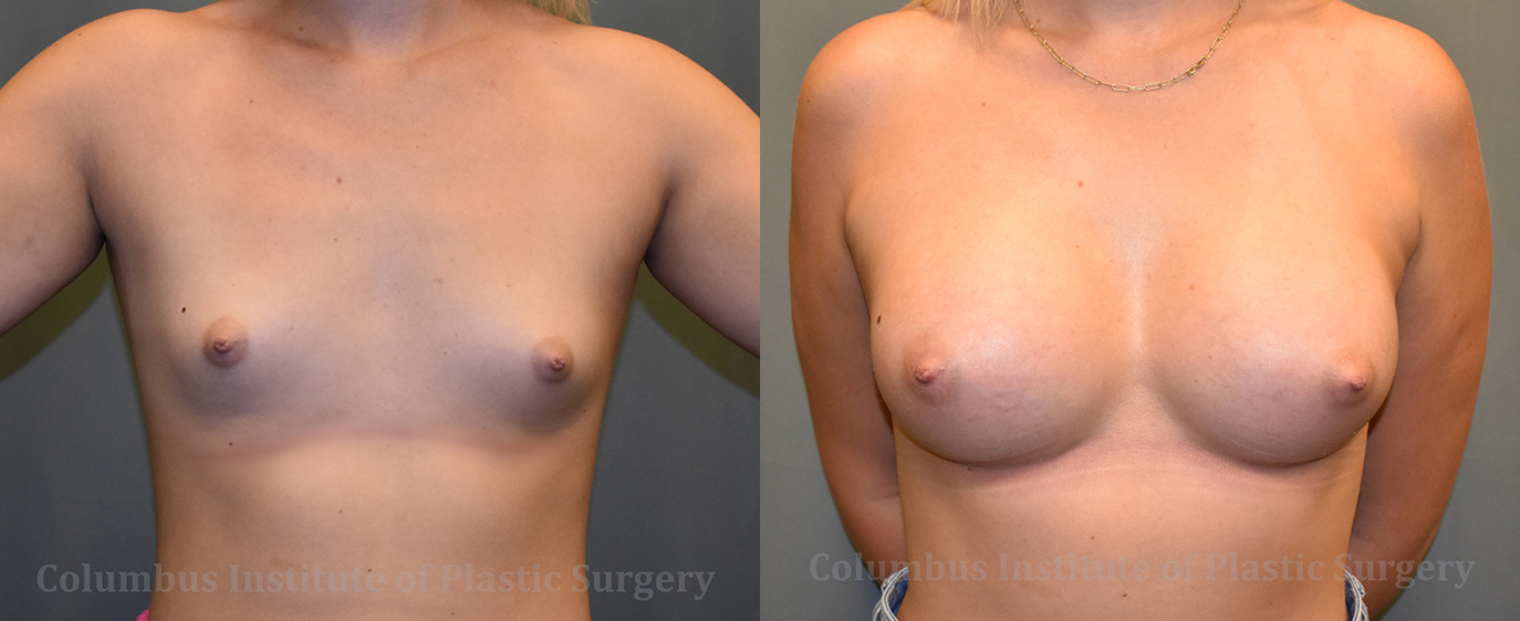 This is a 21-year-old from Zanesville, Ohio knew she wanted breast implants, but was very careful to go about the process cautiously. She did her research, and found board-certified and top-rated breast augmentation surgeon Dr. Bivik Shah at the Columbus Institute of Plastic Surgery, and happily scheduled a consultation. She was careful to choose implants that were not too large for her frame. Ultimately, she chose 475 cc silicone implants. She looks beautiful! She is shown here pre-operatively, and 6 months following surgery.