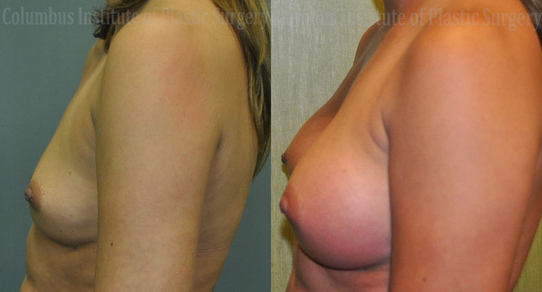 This 38 year old woman came from Indianapolis, IN to Columbus after doing much research about breast augmentation and finding Dr. Bivik Shah, the board certified plastic surgeon. She felt that a breast augmentation would get her the exact look she wanted! She came to Columbus Institute of Plastic Surgery for a consultation where she learned about the different styles and types of implants we offer. Dr. Shah placed 400cc Silicone breast implants below her muscle in a normal fashion. The incision 9scar) in hidden in the crease of the breast (inframammary). The after photo of this woman was taken 3 months after her surgery.
