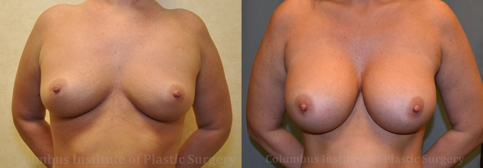 This is a 27-year-old woman from Columbus, Ohio who was unhappy with the size of her breasts and had long been considering breast augmentation (breast implant) surgery. She found top-rated plastic surgeon Dr. Bivik Shah at the Columbus Institute of Plastic Surgery and scheduled a consultation. She immediately felt at ease with his knowledge and experience. Surgery was scheduled, and she confidently chose 450 cc high profile silicone implants. She is photographed here before and 8 months following surgery.