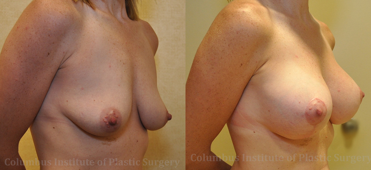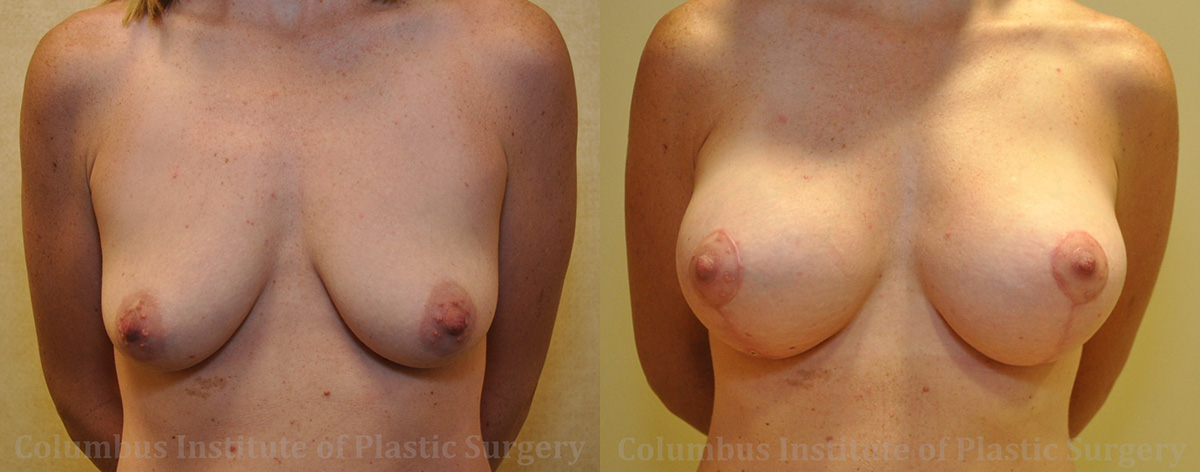 This beautiful 35-year-old woman from Mansfield, Ohio found top-of the-field surgeon Dr. Bivik Shah, when she was ready to reclaim her breasts shape / size. She desired a firmer, more volumized appearance. Dr. Shah advised a mastopexy (breast lift) with silicone implants. She chose 400 cc silicone breast implants and is positively loving her results! She is shown here before surgery, and 3 months post-operative.
