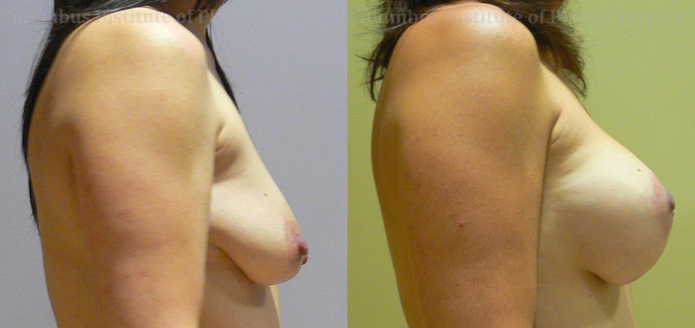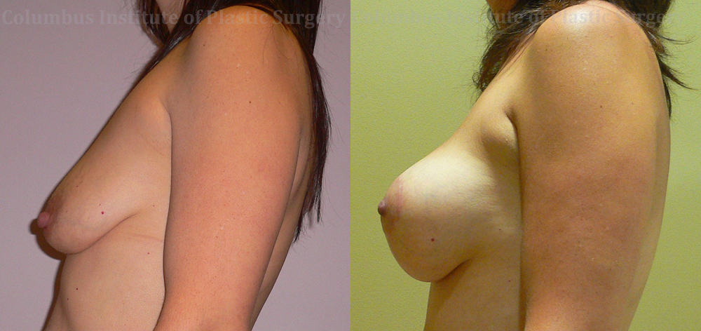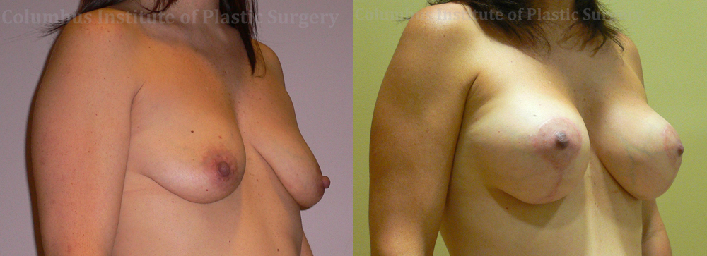 This 38 year old patient from Columbus, Ohio came to see Dr. Shah to discuss how to best enhance her breasts, as she was unsatisfied with the drooping and overall size of her bust. Dr. Shah performed a Mastopexy (breast lift) with 350 cc silicone implant augmentation. She is photographed here before surgery, and 5 month post-operatively.
