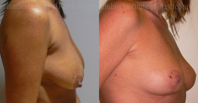 This woman had breast lift (correcting breast sag). The after pictures were taken 3 months after surgery. To do a breast lift, it means putting scars on the front of the breast and she has incision around the areola (the dark circle on the breast), straight down to the breast crease, and side to side. The incisions will hide even more by about 6 months after the breast lift surgery.