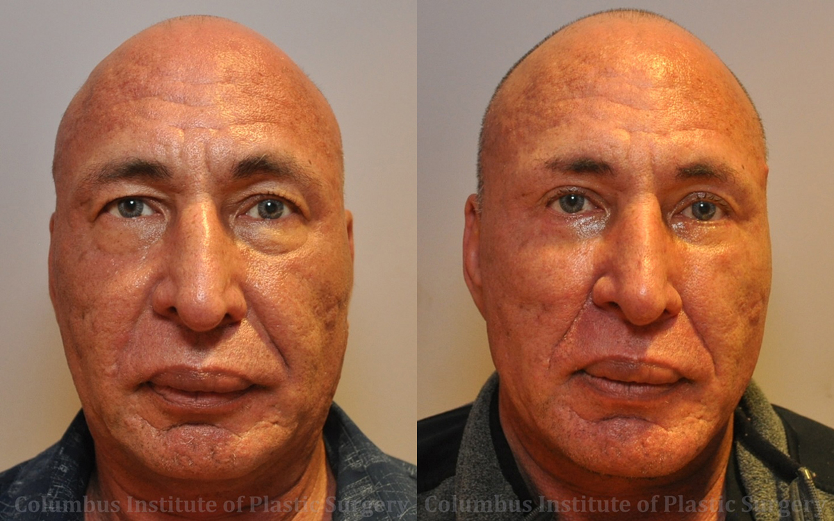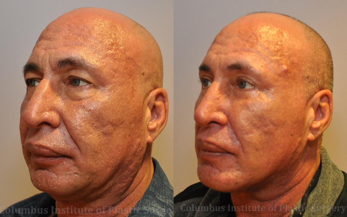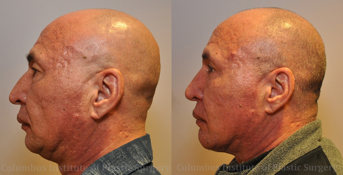 This is a 55-year-old gentleman from Canal Winchester, Ohio who came to The Columbus Institute of Plastic Surgery to meet with Dr. Bivik Shah. He was not happy with the lack of definition in his chin. He and Dr. Shah decided that a chin implant would benefit him greatly and surgery was scheduled. The incision is made under the chin and is very easily hidden. He is much more satisfied with the overall aesthetic of his face and is pictured here before and 4 months after surgery.