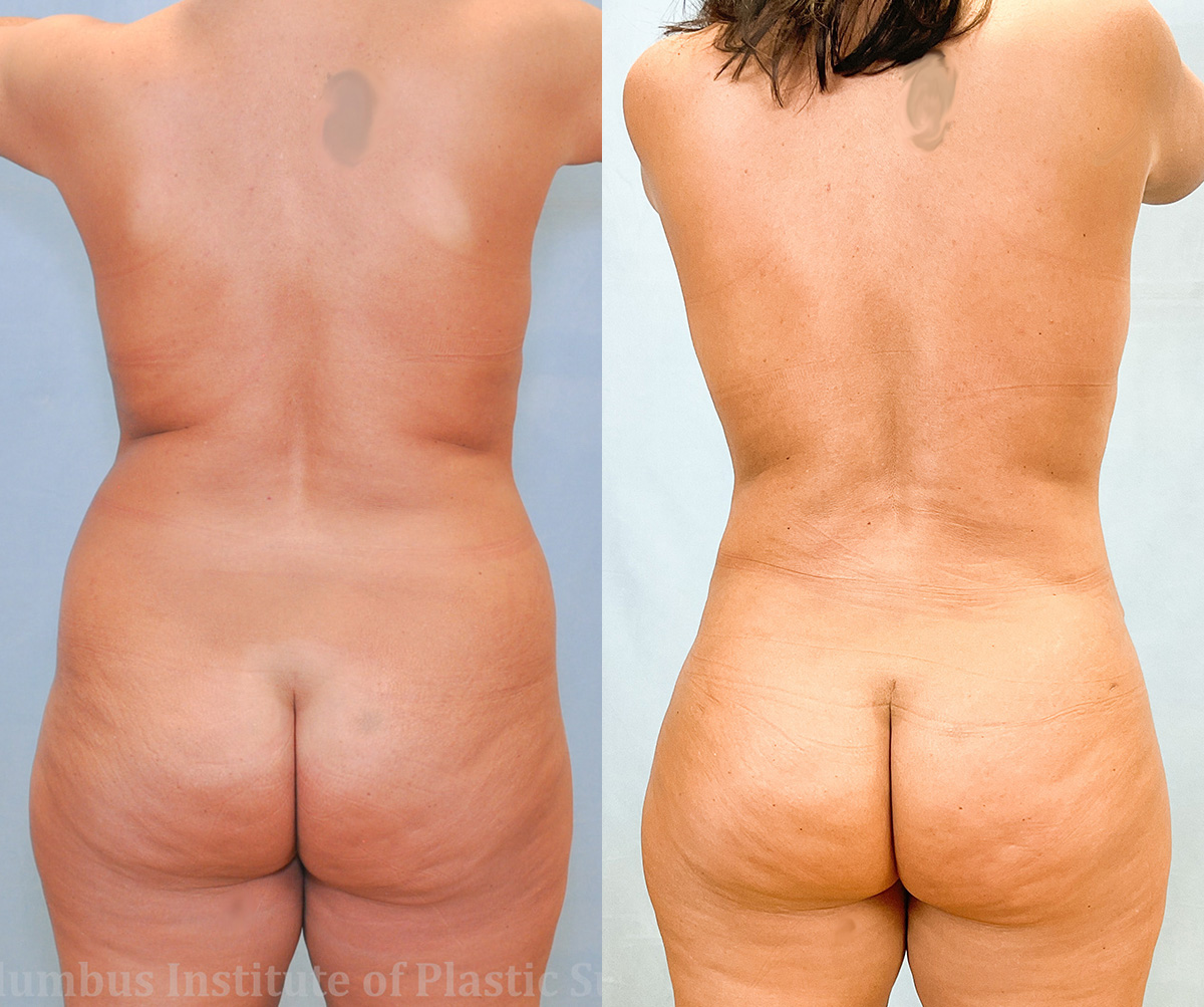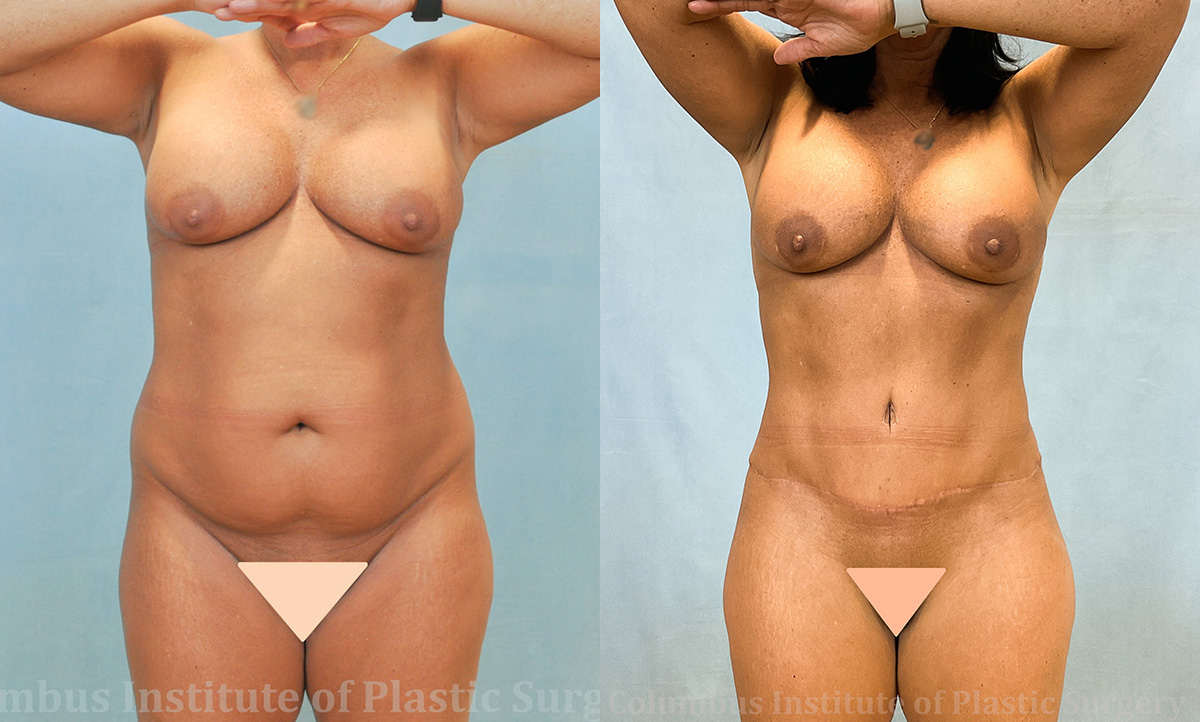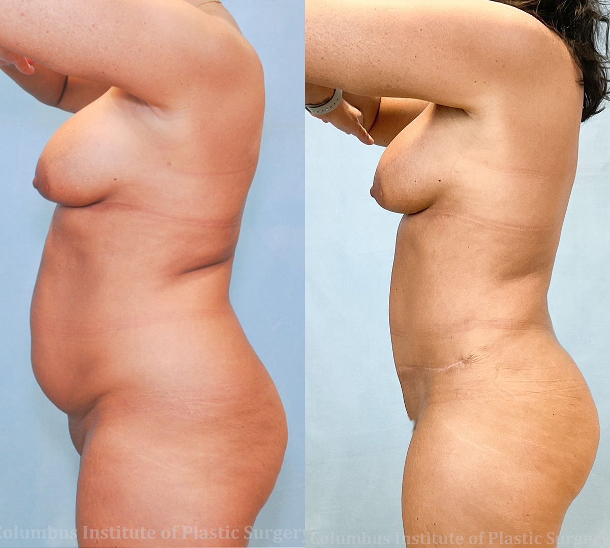 This is a 45-year-old woman from Heath, Ohio who came to the best place for tummy-tucks (abdominoplasty), The Columbus Institute of Plastic Surgery to consult with our top surgeon Dr. Bivik Shah about abdominoplasty (tummy tuck) and liposuction surgery. The tummy tuck incision runs from hip to hip and tends to be hidden very nicely below the panty-line for a natural look. Between the two procedures she had a total of 8.6 pounds of skin and fat removed. She is shown here before and 6 months post-surgery.